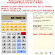 The said payments of EUR 135 000 000 000 EUR, and total payment €: = 270 miliards EUR, we request to pay within the deadline: within 2 months, from the date of publication of this written Request, (published written Request on 2025 June 07, for the execution of the mandatory payment, from the said EC EU President Urshula Leyen and her supporters, including her supporting EU Member States).